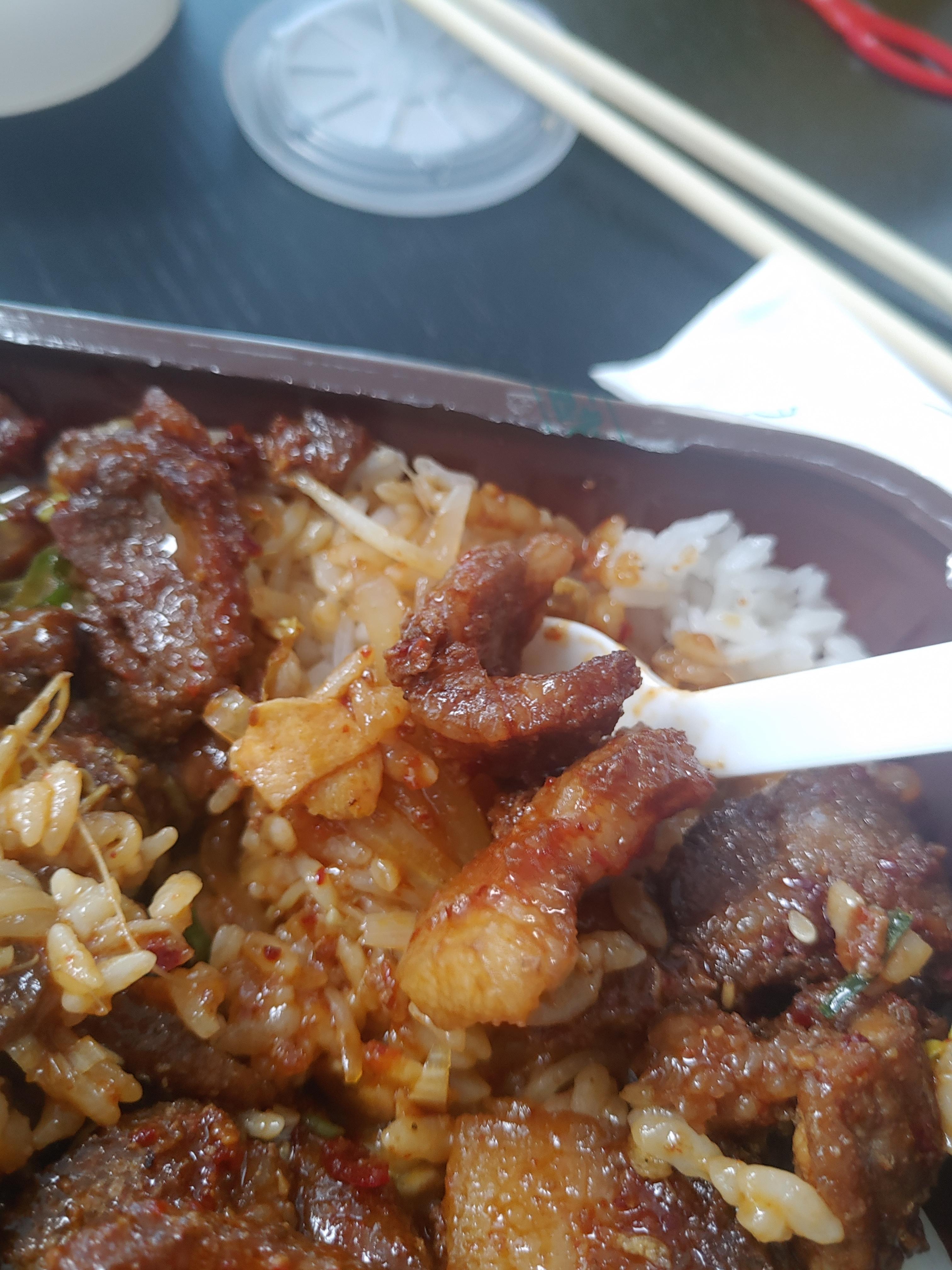 전체적인 맛은 약간 매콤한 갈비 느낌인데요. 부위가 갈비는 아닌 것 같기는 했지만 그래도 양념은 확실히 잘 되었다는 느낌입니다. 매콤함이 느끼함을 좀 잡아주는 편이긴한데, 약간 느끼함도 있습니다. 그래서 그런지 전체적으로 밥이랑 잘 어울리도록 구성한 느낌이더라구요.