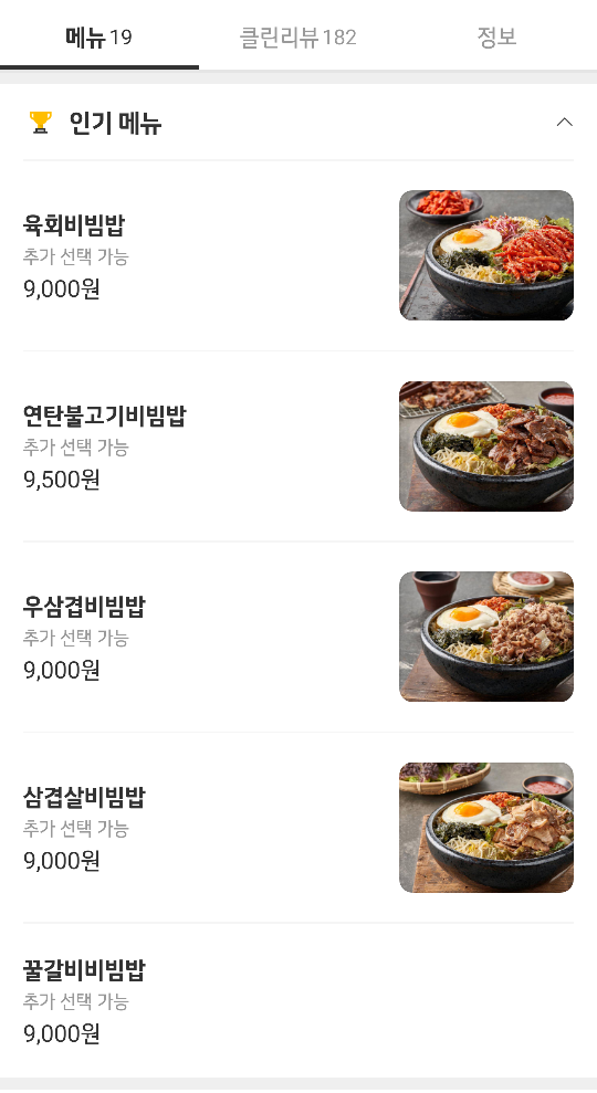 배달은 1시간 이내로 도착을 했습니다. 저는 삼겹살이 들어간 비빔밥으로 골라봤는데요. 위에 메뉴에서도 보셨듯이 육회, 연탄불고기, 우삼겹등등이 있습니다. 말 그대로 고기가 듬뿍 들어간 대왕비빔밥이기를 바라면서 ㅎㅎ 메뉴를 열어봤는데요.