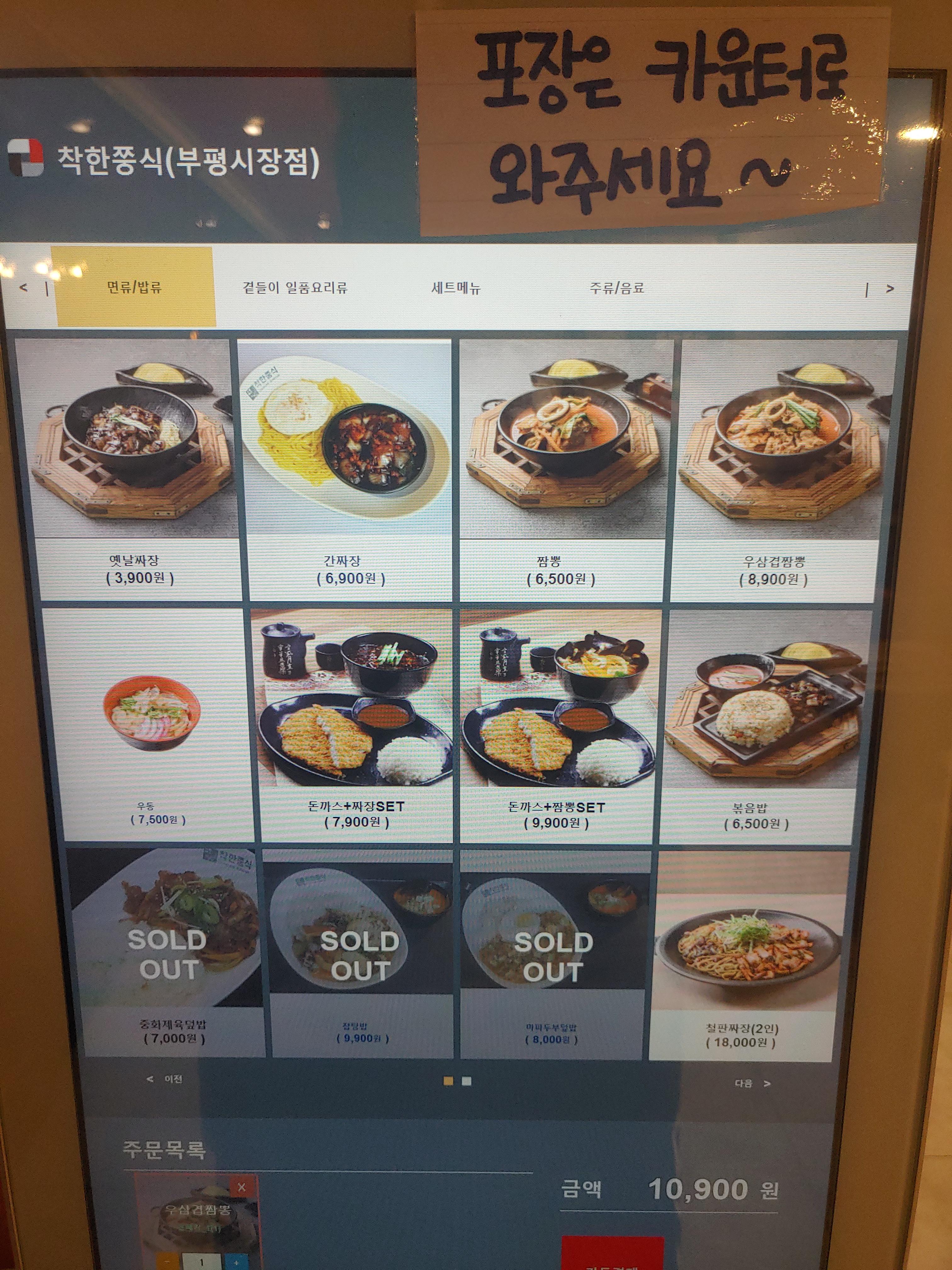 키오스크 주문을 하려고 보니까 이름이 착한쭝식인것 답게 옛날짜장 3900원으로 가격이 꽤 저렴하더라구요. 그런데... 그외에는 사실 저렴하다고 생각은 안들었습니다. 다른 중화요리와 가격은 비슷비슷한 것 같았어요.
