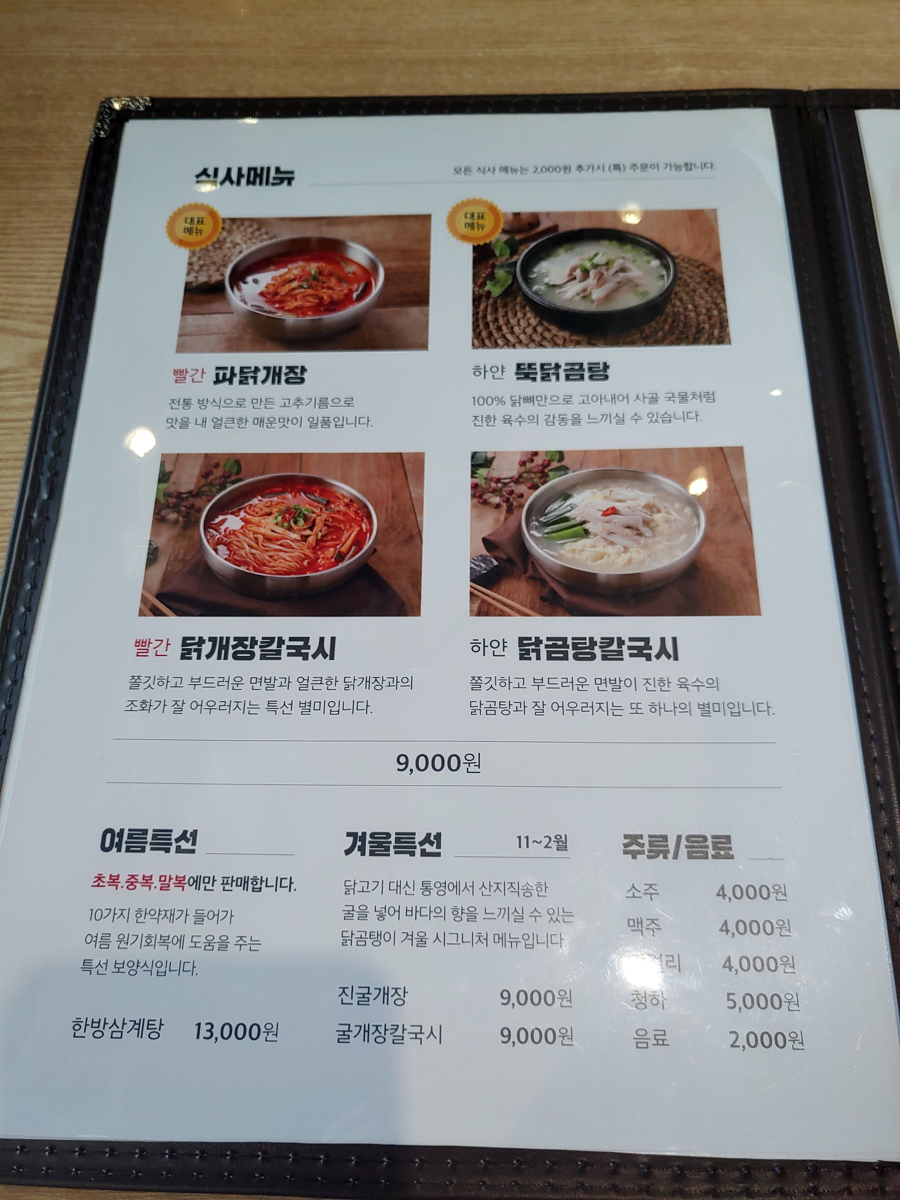 파닭개장, 뚝닭곰탕, 닭개장 칼국시, 하얀 닭곰탕 칼국시 메뉴들이 주 메뉴인데요. 가격은 네가지 모두 9천원 그리고 특 (곱배기) 주문을 하면 2천원인가 추가되요.