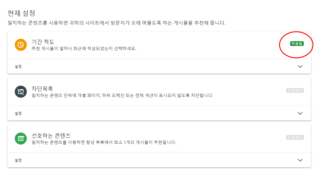다음과 같이 기간척도는 추천게시물이 기간에 따라서 추천이 될 수 있도록 설정을 해주는 것이며, 차단목록은 표시되지 않도록 차단하는 설정, 그리고 선호하는 콘텐츠는 일치하는 콘텐츠를 사용시에 항상 목록에서 최소 1개의 게시물을 추천할 수 있는 URL을 입력할 수 있는 곳입니다.