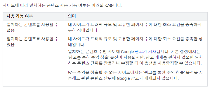 일치하는 콘텐츠는 일부 게시자만이 사용할 수 있다고 구글은 밝히고 있는데요. 구글에서는 일치하는 콘텐츠를 사용하기 위한 조건으로 트래픽 규모 및 고유한 페이지 수에 대한 최소 요건을 충족하도록 하고 있습니다.