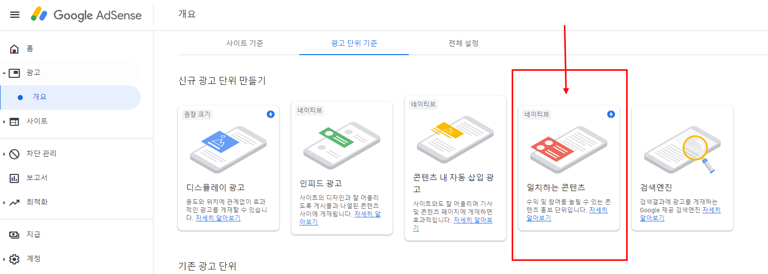 애드센스 일치하는 콘텐츠가 승인이 났다면, 사이트 설정을 통해서 활성화 해주고, 다음과 같이 광고단위를 새롭게 설정해서 수동으로 일치하는 콘텐츠의 광고단위코드를 발급받아서 수동으로 코드를 추가할 수 있습니다.