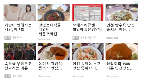 애드센스를 하시는 모든 분들이라면 한번쯤 티스토리 또는 워드프레스등 여러가지 블로그 및 홈페이지에 달려있는 광고 중에서 특이하게도 여러가지 콘텐츠들이 링크처럼 달려있는 모습을 보신적이 있으실텐데요. 바로 아래사진처럼 달려 있는 여러가지 블로그의 콘텐츠와 함께 광고들이 노출되는 경우를 이야기합니다.