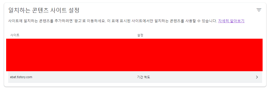 애드센스 설정창에 보면 사이트에 일치하는 콘텐츠 사이트 설정이 될 수 있는데요. 다음과 같이 사이트에 일치하는 콘텐츠로 다음과 같이 해당 사이트가 등장을 했다고 하면 일치하는 콘텐츠를 적용할 수 있는 조건을 달성한 것이라고 볼 수 있습니다.