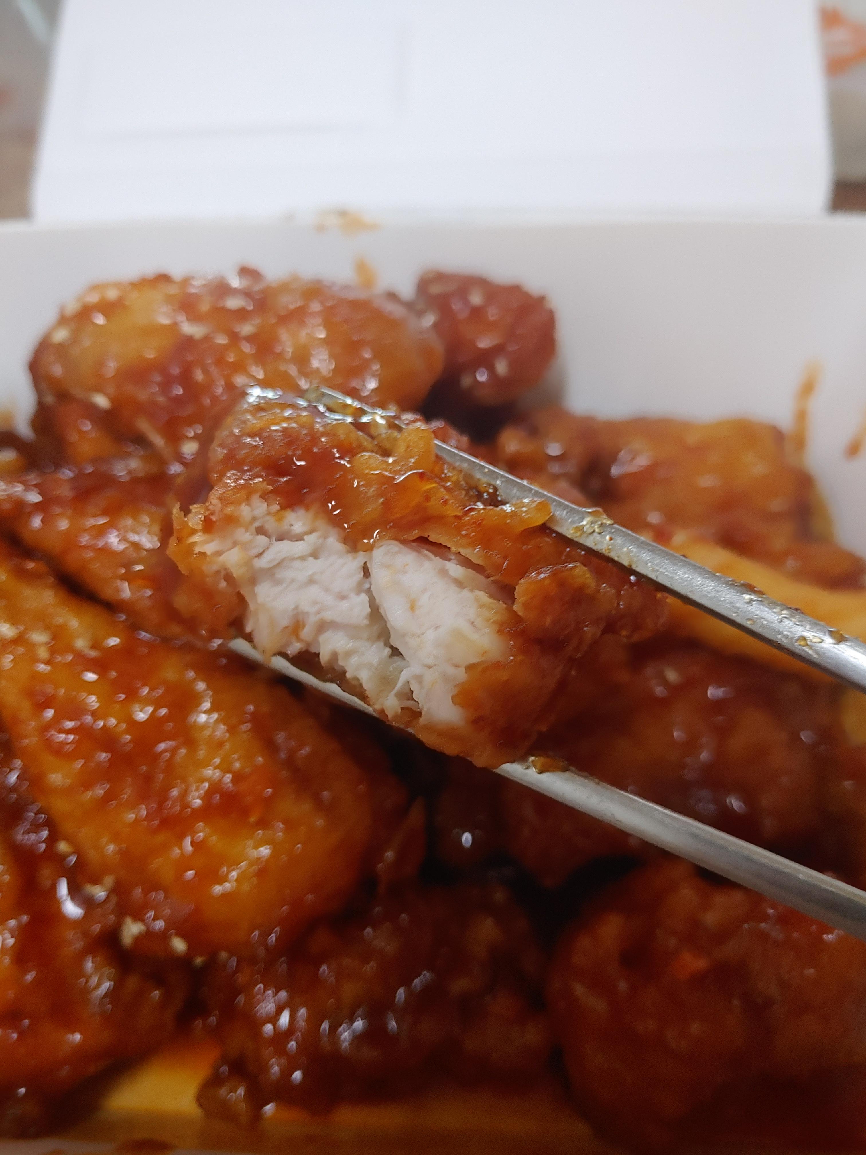전체적으로 치킨의 양도 굉장히 많다고 느껴지는 것이, 치킨 자체가 좀 크다고 느낌을 많이 받았어요. 뭐 매장마다 같은 호수의 치킨을 쓴다고 하는데, 실제로 오는 것을 보고 비교해보면 치킨의 차이가 좀 느껴지는 경우들도 있는데요. 부평맛집 멕시카나 부평광장점의 양념치킨이 실제로 보면 다른 곳에서 먹어봤던 치킨에 비해서 맛이 엄청 좋고 두툼하고 맛있더라구요.