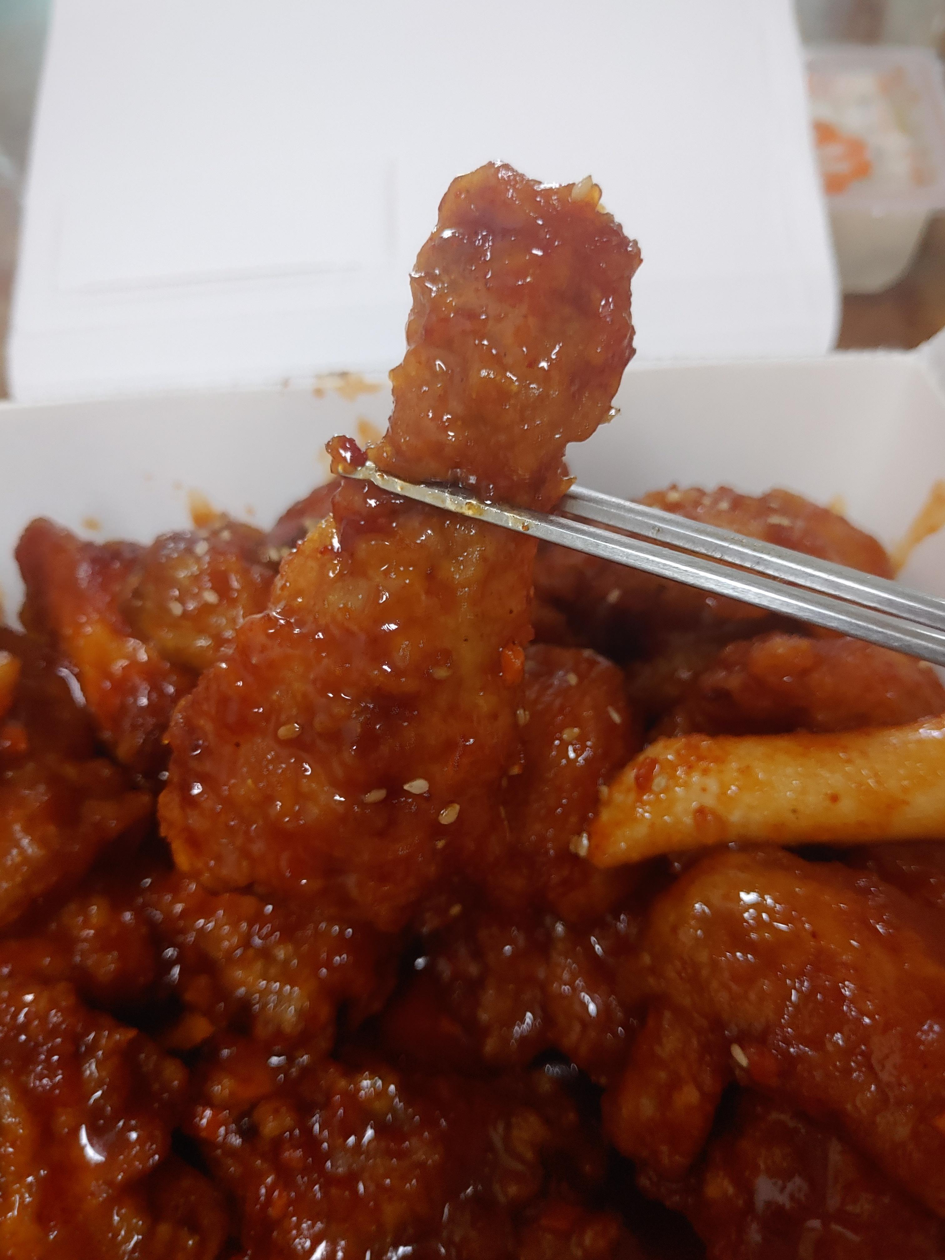 닭다리와 날개 ㅎㅎ 최근에는 뼈없는 순살치킨도 엄청 자주 먹고는 했는데, 이렇게 뼈있는 치킨이 땡기는 날도 있는 것 같아요. 뼈있는 치킨은 아무래도 이렇게 닭다리와 날개 먹는 재미도 있구요 ^^