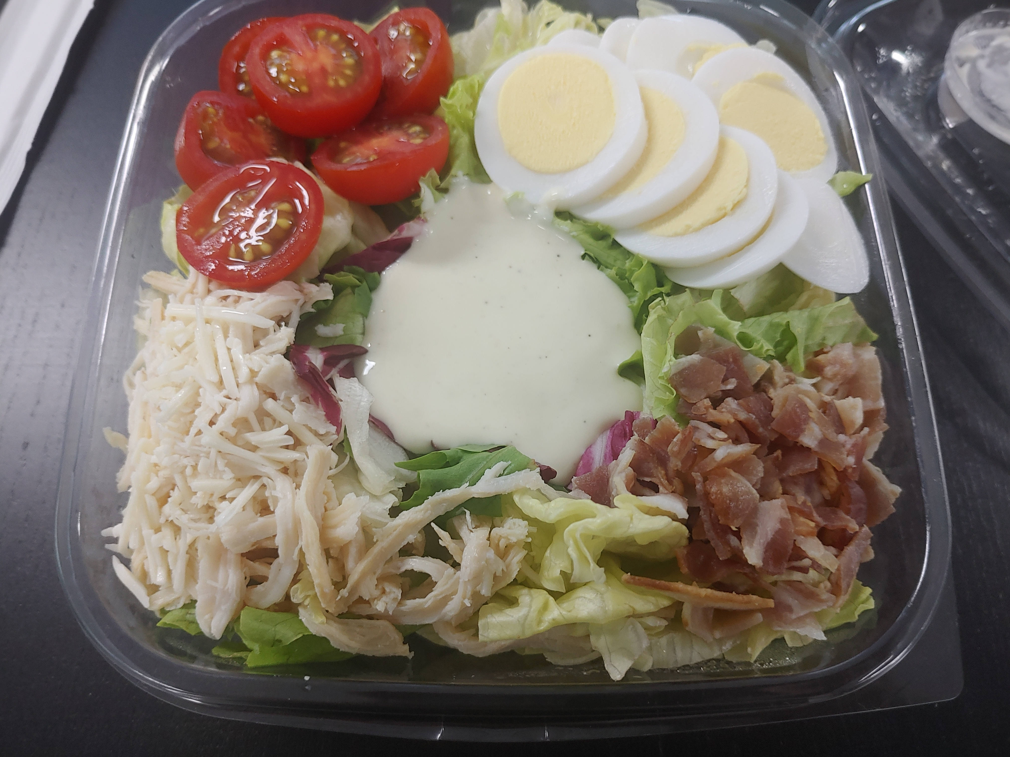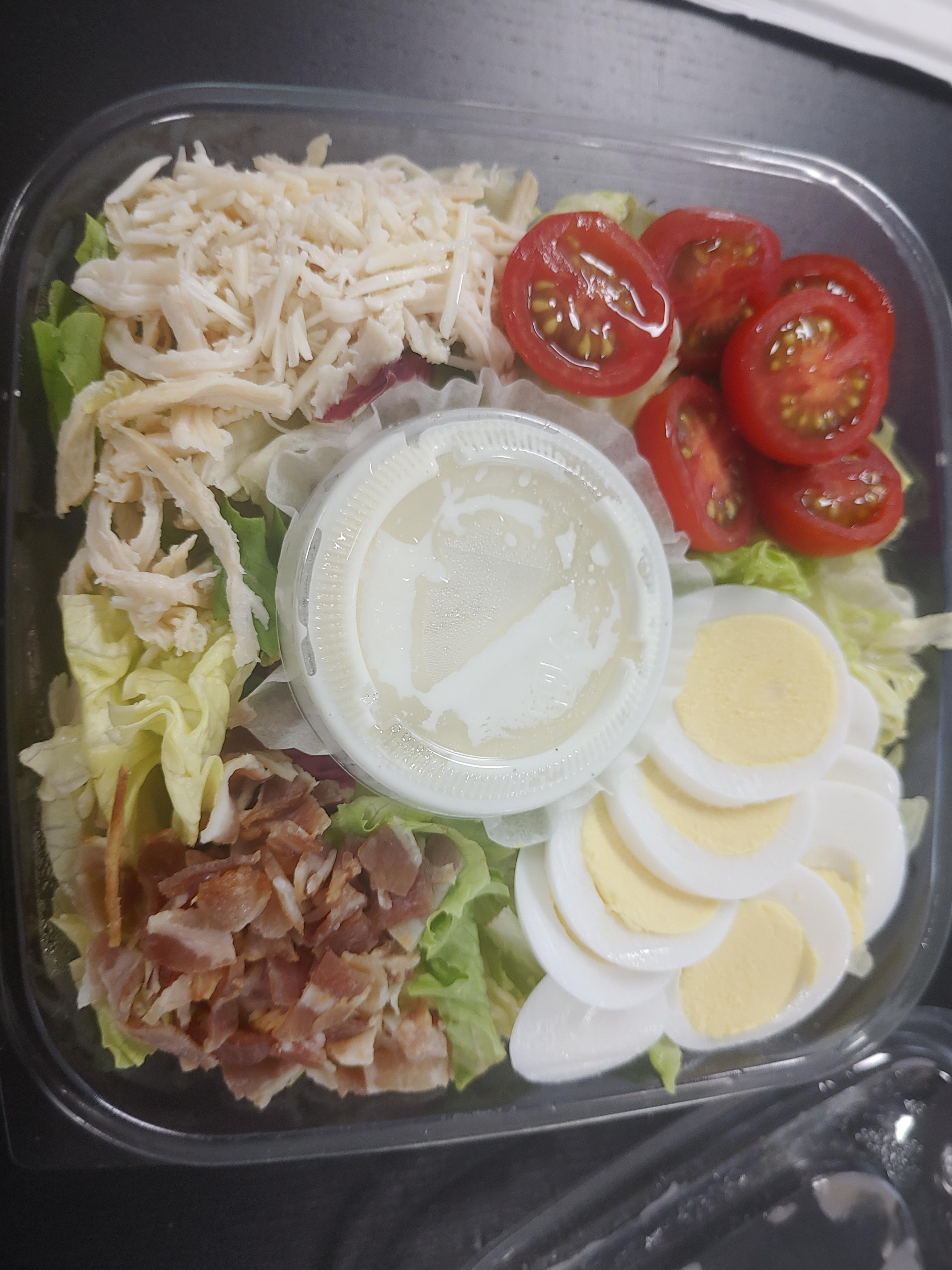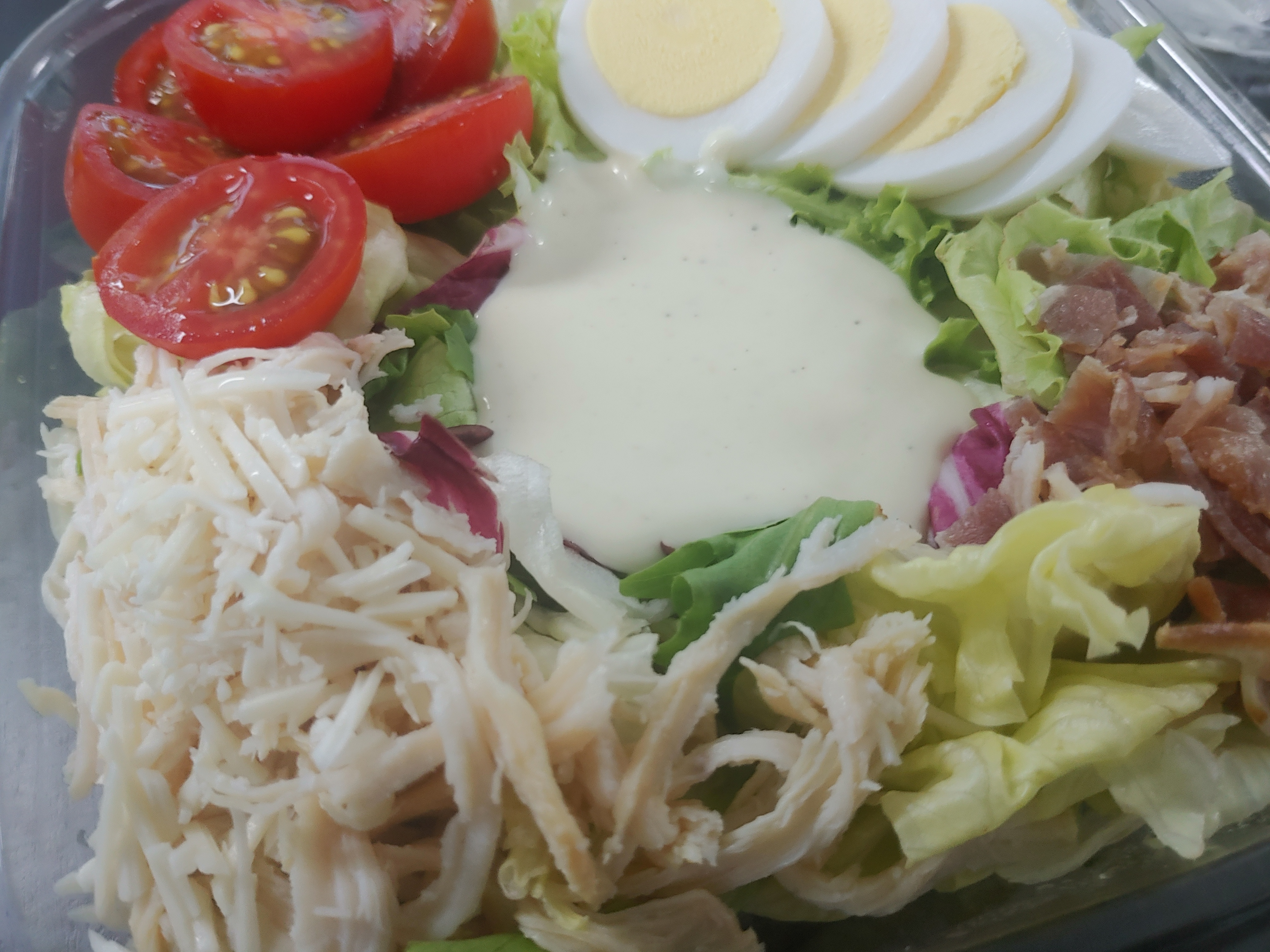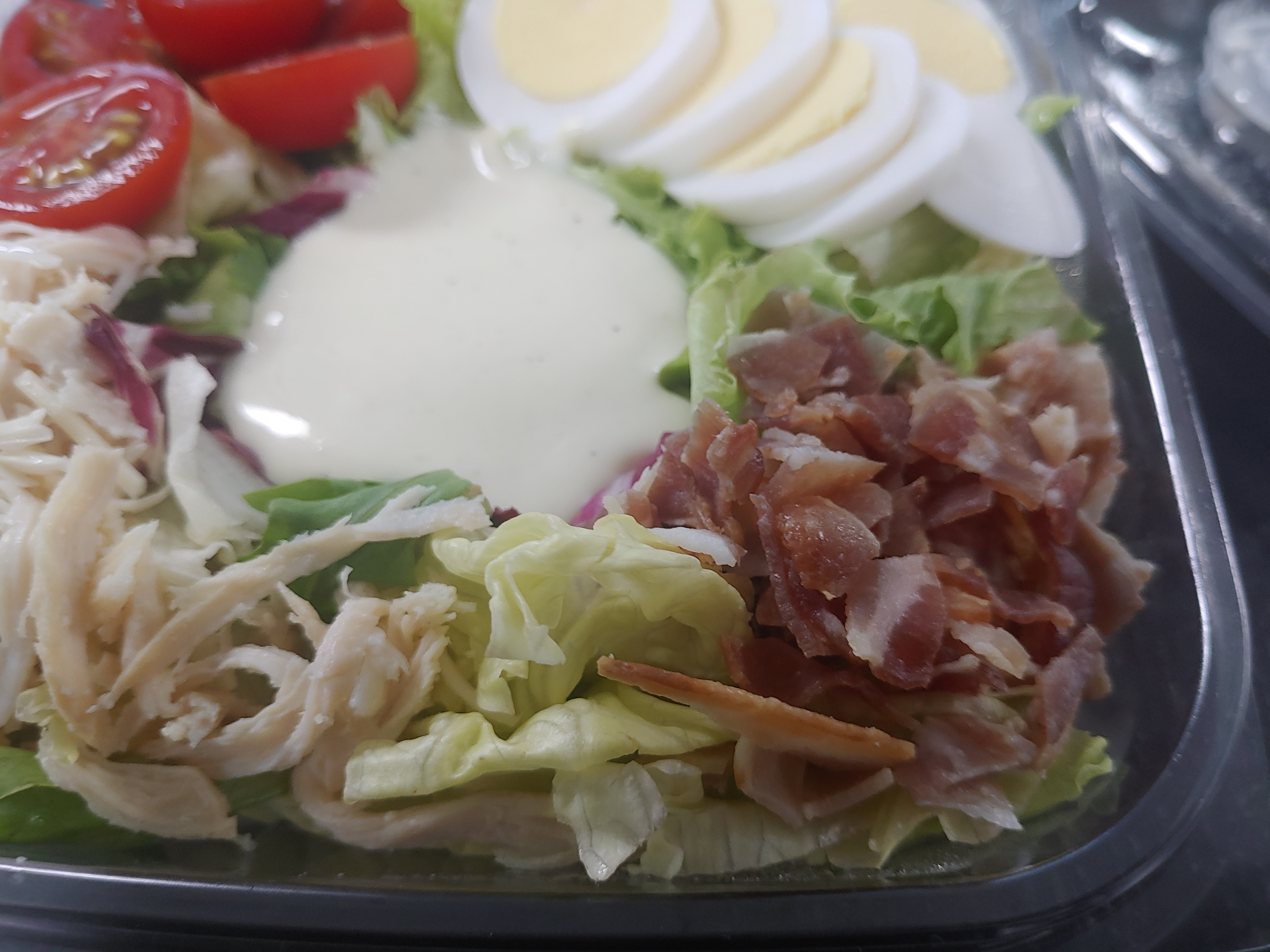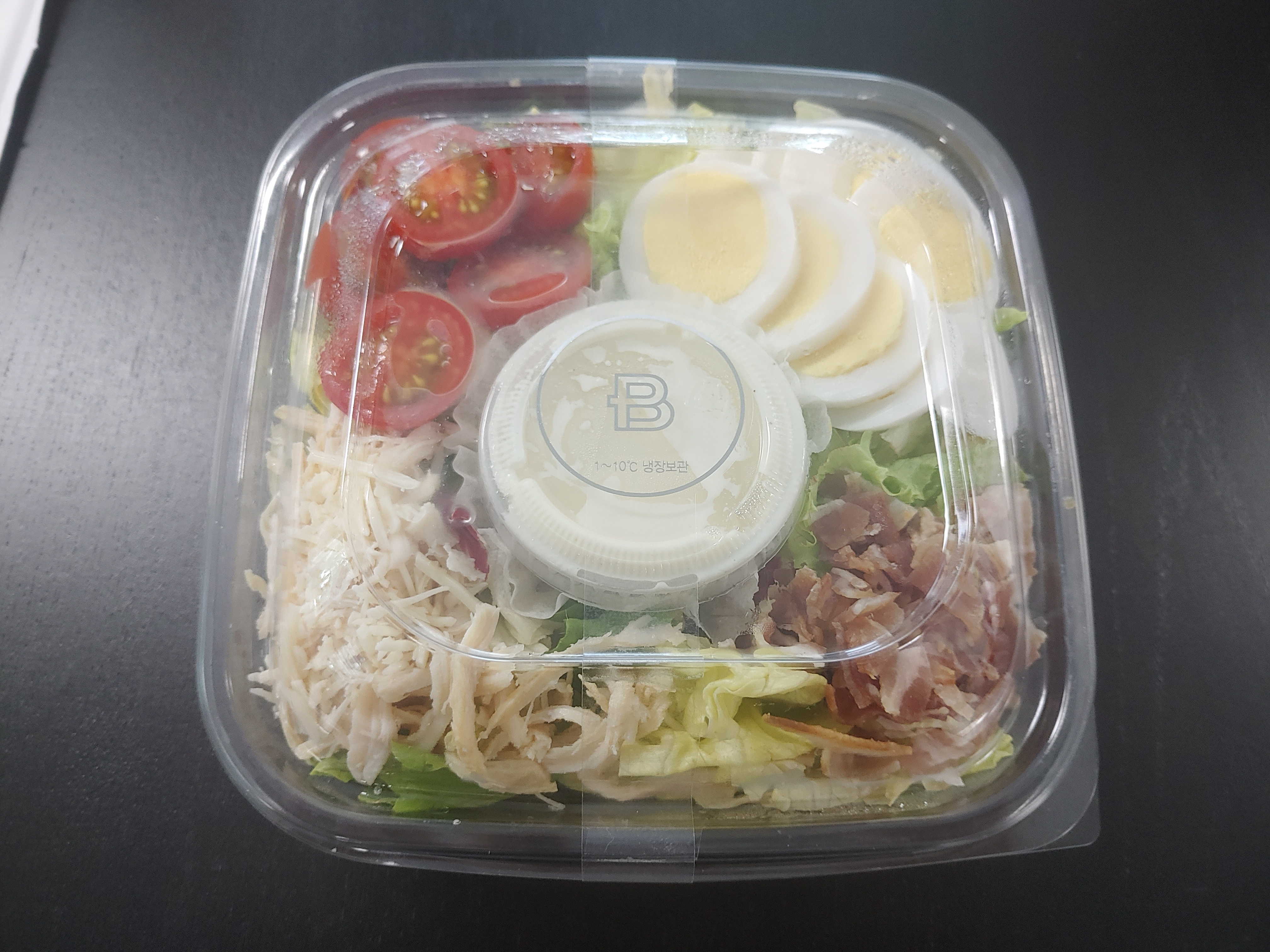 닭가슴살을 얇게 저민 치킨과 베이컨 그리고 계란까지 구성이 괜찮아요. 아래는 다 양상추와 같은 야채들이 있구요. 방울토마토도 있고, 시저소스 자체가 맛이 있어서 그런지 전체적으로 맛있는 샐러드에요 ㅋ
